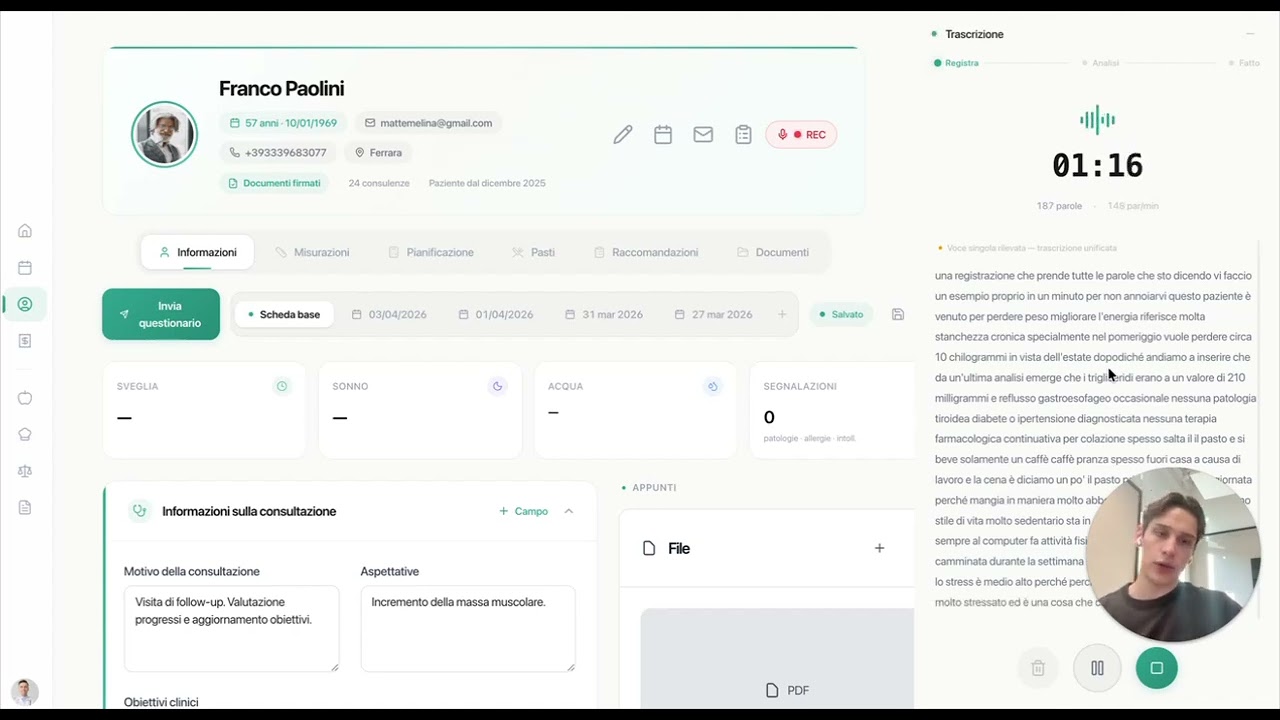 The artificial intelligence analyzes the conversation, extracts key information and automatically creates a structured recap. Identifies allergies, intolerances, conditions and patient goals.